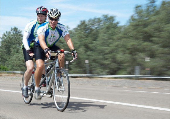 Велосипед-тандем придумали два века назад. По легенде, его изобрел некий мужчина для своей жены, которая не умела ездить на велосипеде, но очень хотела разделить с мужем увлечение двухколесным средством передвижения. Что на самом деле побудило изобретателя создать тандем, никто не знает, но наверняка, без любви здесь не обошлось. Популярным тандем стал в конце XIX – начале XX века, а сразу после Второй мировой войны о нем как будто забыли. Тяжелый, неповоротливый, громоздкий, однако такой удобный для тех, кто не может самостоятельно сесть за руль, но так хочет покрутить педали. Тандем был и остается идеальным средством передвижения для слепых и слабовидящих людей. «Езда на нем похожа на танцы. Один в паре берет на себя управление, а второй полностью ему доверяет и подчиняется», — говорит слепоглухая спортсменка из Оттавы Пенни Леклер. Действительно в тандеме жестко распределены роли велосипедистов. Спереди сидит пилот, который отвечает за управление, торможение и переключение скоростей. Сзади — стокер (от англ. stoker – «кочегар»), который добавляет мощности, как будто подкидывает в топку дрова. Подобрать пилота, как и стокера, — дело не из легких. Американцы создали специальный сайт, на котором люди с ограниченными возможностями здоровья могут найти партнера по езде в тандеме. Вы регистрируетесь, заполняете анкету, в которой указываете рост, вес, тип езды и свой опыт в педалировании. Затем находите пилота или стокера, списываетесь с ним и уточняете характеристики велосипеда, дни и время суток для прогулок, а также согласовываете маршрут. Понять, подходит ли партнер или нет, вы сможете после первой же поездки. «По манере педалирования я сразу могу сказать осторожный человек, застенчивый или полон энергии», — рассказывает Пенни Леклер. В Мексике к помощи интернета в таких случаях не прибегают. С 2010 года в центре Мехико проходит акция «Слепая тропа». Утром каждого воскресенья группа волонтеров от трех общественных организаций бесплатно организует для людей с нарушением зрения велосипедные прогулки по городу. Зрячие добровольцы выступают в качестве пилотов, стокером может стать любой желающий независимо от пола и возраста.