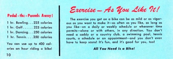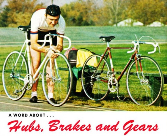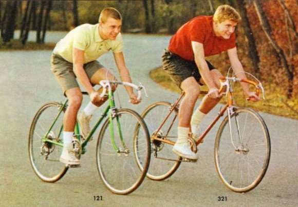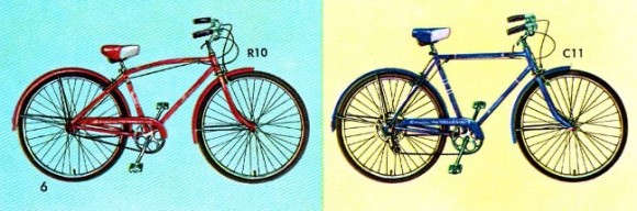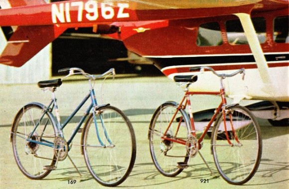 (Справа) Все что велосипедист хочет получить от поездки. Легкая и прочная хромомолибденовая стальная рама 10 скоростей, Sprint переключатель, передачи от 38 до 96, 27 "х 1 1 / 4" шоссейные шины. Цвета: Radiant Coppertone, Sky Blue или Terra Cotta or Violet..