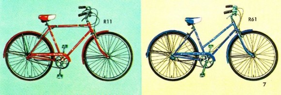 (Справа) Новая бюджетная модель с 5-ю скоростями, передачи от 45 до 85, диски Schwinn, 26 "х 1 3 / 8" нейлоновые шины, туристических руль и седло. Цвета: Flamboyant Red, Radiant Blue, Coppertone или Black. Также доступна женская модель, C61, в таких же цветовых гаммах.
