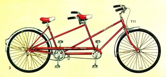 (вверху) Двухместный прочный велосипед. Надежное оборудование. Ручной передний тормоз. Колесные диски, 26 "х 1 3 / 4" шины. Цвета: Красные Flamboyant, небесно-голубые или белые.