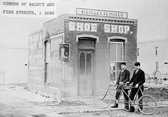 Ну и на последок совсем винтажное фото — 1890 год! Не правда ли очень интересный тандем на фото? Да и "будочка" с магазином обуви, а по совместительству и веломастерской заслуживает внимания!