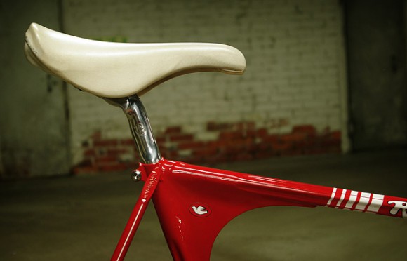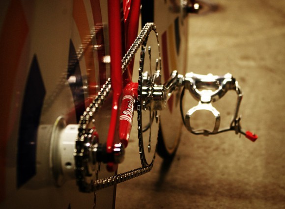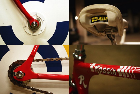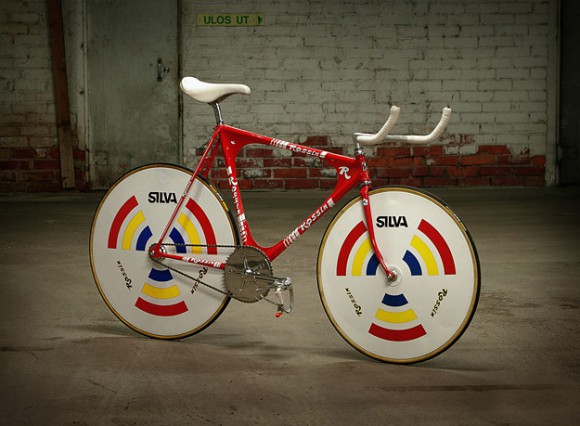 Геометрия в стиле Cinelli Laser добавляет велосипеду аэродинамику, а заднее колесо сделано специально идентичным с передним. Цвет и детали выбраны не случайно. Они имитируют знаменитую "Rosso Corsa" — классический цвет итальянских спортивных и гоночных автомобилей. Причем декали Olli специально восстаналивал, основываясь на старых снимках гоночных автомобилей.