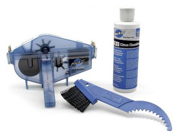 Набор для чистки цепи от Park Tool, состоящий из машинки для промывки цепи, чистящего средства и специальной щетки.